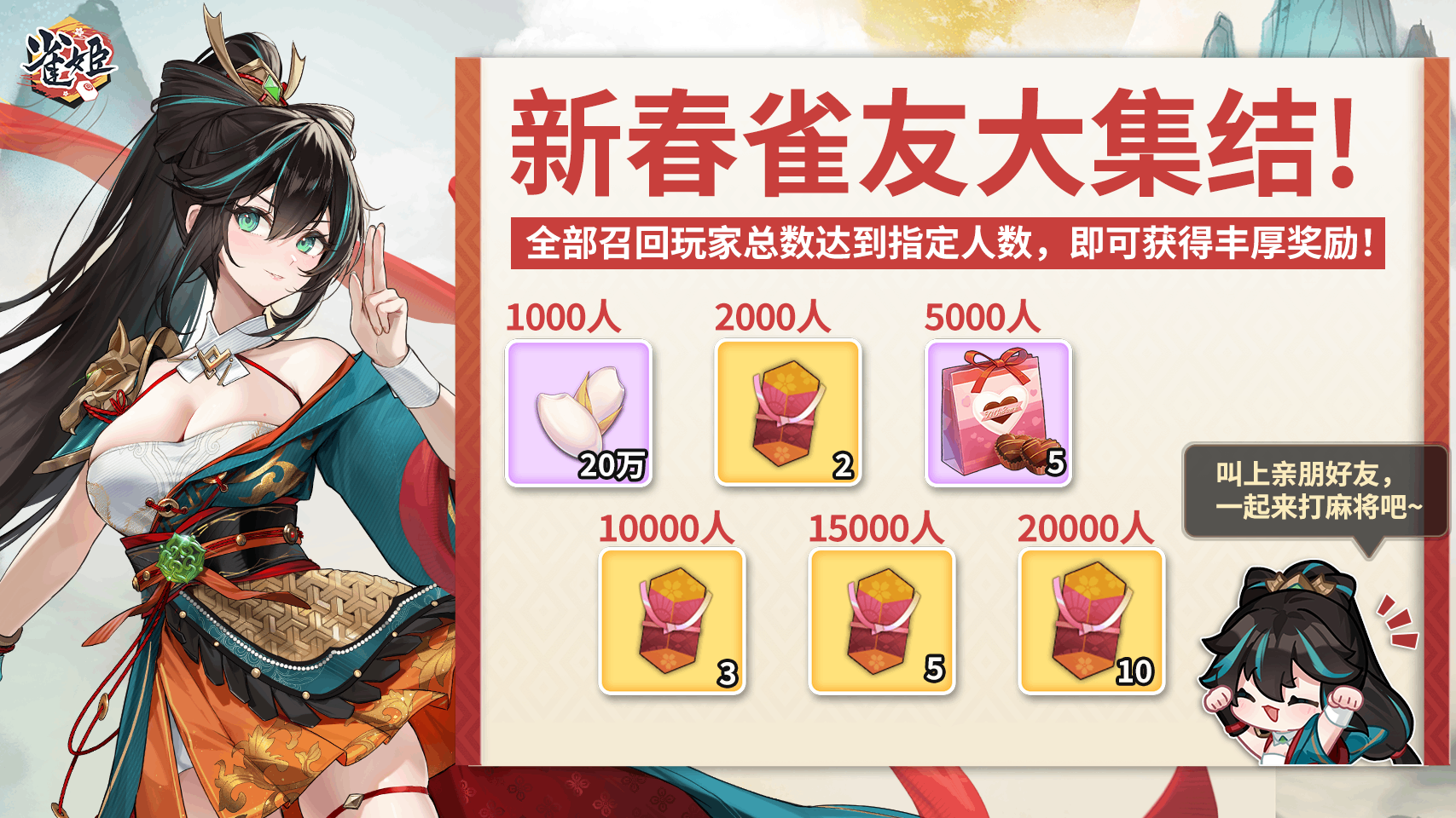 新春雀友大集结!全服回归玩家总计达到指定人数,即可领取丰厚奖励!
